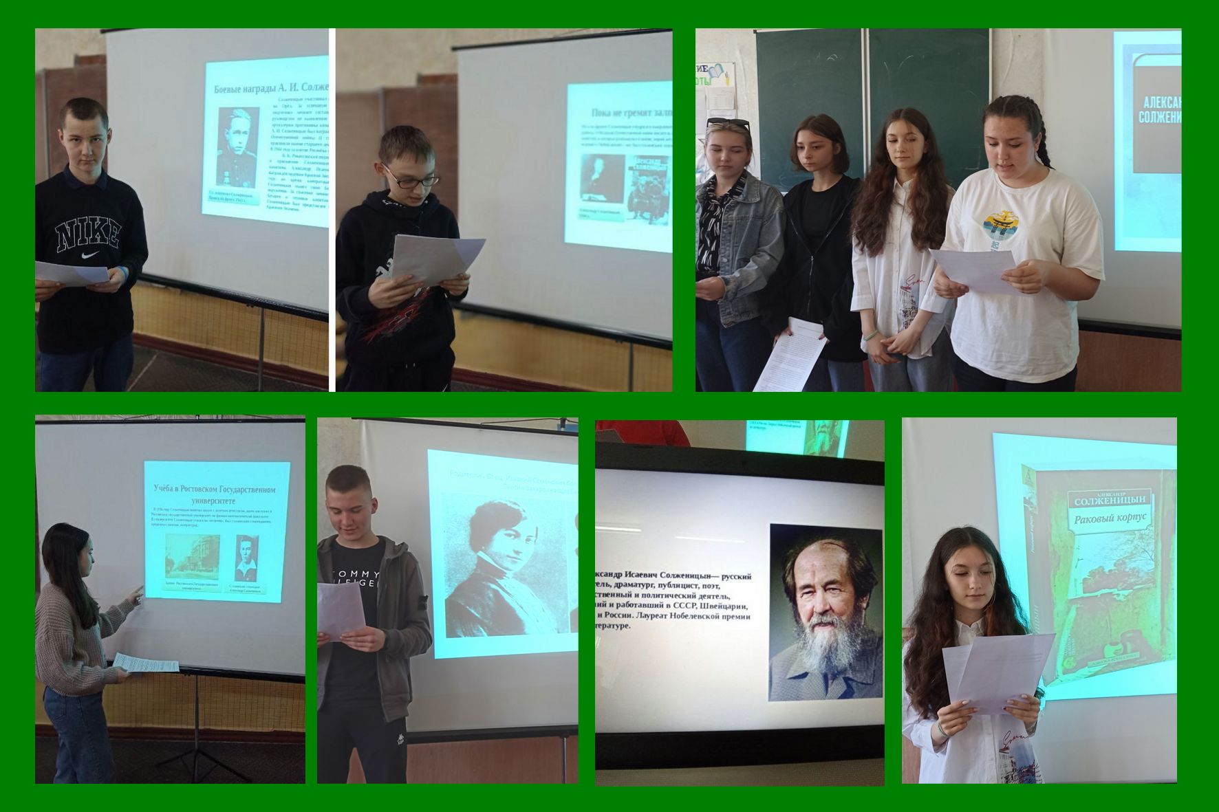 Подходит к завершению 2022-2023 учебный год. Обучающиеся 8 и 9 классов подготовили коллективную защиту проекта по творчеству А.И. Солженицына приуроченного к Году педагога и наставника (учитель Чернышкова И.В., зав. библиотекой Конева Е.А.). Почему выбрали его? Александр Солженицын — оригинальный писатель с собственным стилем и манерой, создатель полифонического романа. Читать дальше...